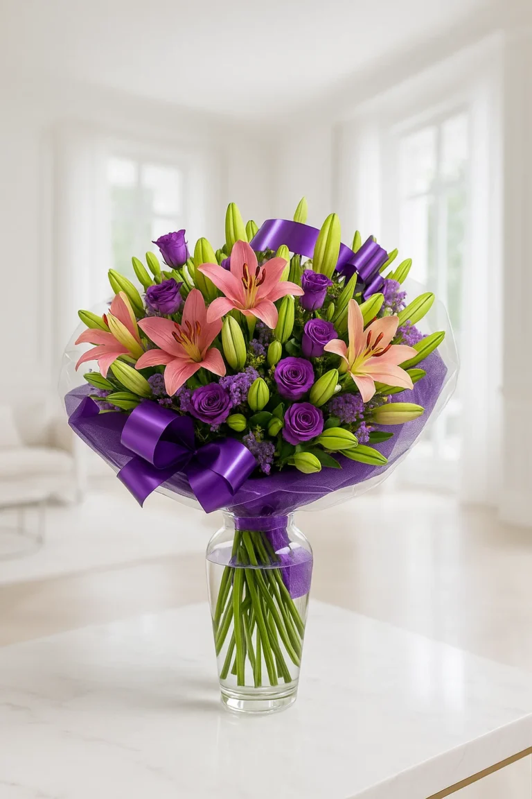 שילוב של ליליות ורודות וליזיאנטוס סגול
